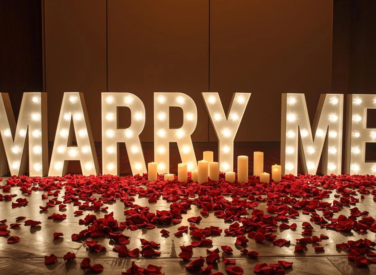Large marquee letters, candles, and rose petals with a bottle of cool prosecco to celebrate.
